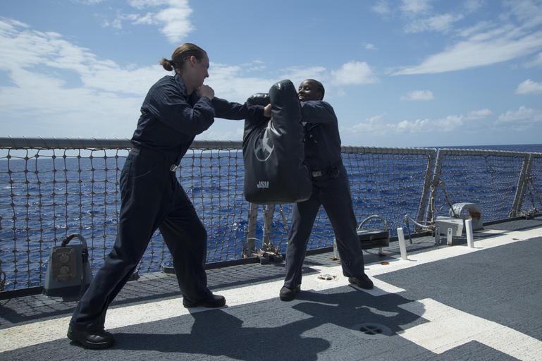 | Keywords: uss carney (ddg 64); 6th fleet; usscarneyddg646thfleet mediterranean sea mediterraneansea outdoor 160824-N-ZE250-050 MEDITERRANEAN SEA (Aug. 24, 2016) - Operations Specialist Seaman Kristy Shearer, left, and Operations Specialist Seaman Mary Brown practice basic hand-to-hand combat during the Security Reaction Force Bravo course aboard USS Carney (DDG 64) while on patrol in the Mediterranean Sea Aug. 24, 2016. Carney, an Arleigh Burke-class guided-missile destroyer, forward-deployed to Rota, Spain, is conducting a routine patrol in the U.S. 6th fleet area of operations in support of U.S. national security interests in Europe. (U.S. Navy photo by Mass Communication Specialist 3rd Class Weston Jones/Released) 160824-N-ZE250-050 MEDITERRANEAN SEA (Aug. 24, 2016) - Operations Specialist Seaman Kristy Shearer, left, and Operations Specialist Seaman Mary Brown practice basic hand-to-hand combat during the Security Reaction Force Bravo course aboard USS Carney (DDG 64) while on patrol in the Mediterranean Sea Aug. 24, 2016. Carney, an Arleigh Burke-class guided-missile destroyer, forward-deployed to Rota, Spain, is conducting a routine patrol in the U.S. 6th fleet area of operations in support of U.S. national security interests in Europe. (U.S. Navy photo by Mass Communication Specialist 3rd Class Weston Jones/Released) |