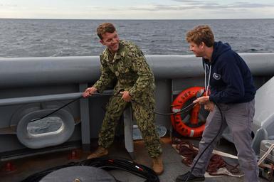 Keywords: 160902-N-TH437-378 NORTH SEA (Sept. 2, 2016) — Navy Diver 2nd Class Mark Gignac, attached to Mobile Diving and Salvage Unit Two and George Schwarz, an underwater archaeologist with the Naval History and Heritage Command (NHHC), recover a magnetometer from the side of the Military Sealift Command rescue and salvage ship USNS Grasp (T-ARS 51), Sept. 2, 2016. Underwater archaeologists from NHHC are aboard Grasp conducting a remote sensing survey of a shipwreck that may be that of Revolutionary War ship Bonhomme Richard. Commanded by John Paul Jones, Bonhomme Richard was lost Sept. 23, 1779 following her victory over the much more heavily armed HMS Serapis. (U.S. Navy photo by Mass Communication Specialist 1st Class Eric Lockwood/Released) 160902-N-TH437-378 NORTH SEA (Sept. 2, 2016) — Navy Diver 2nd Class Mark Gignac, attached to Mobile Diving and Salvage Unit Two and George Schwarz, an underwater archaeologist with the Naval History and Heritage Command (NHHC), recover a magnetometer from the side of the Military Sealift Command rescue and salvage ship USNS Grasp (T-ARS 51), Sept. 2, 2016. Underwater archaeologists from NHHC are aboard Grasp conducting a remote sensing survey of a shipwreck that may be that of Revolutionary War ship Bonhomme Richard. Commanded by John Paul Jones, Bonhomme Richard was lost Sept. 23, 1779 following her victory over the much more heavily armed HMS Serapis. (U.S. Navy photo by Mass Communication Specialist 1st Class Eric Lockwood/Released) |
