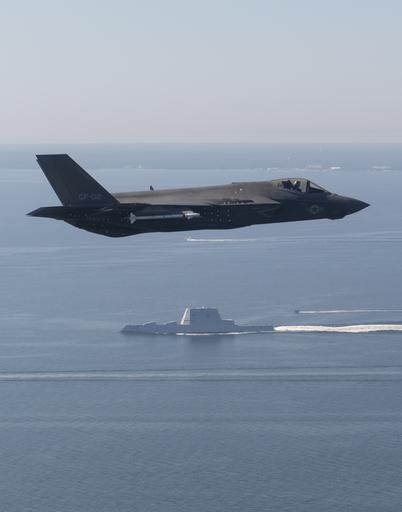 | Keywords: f-35 f35 f-35c f35c navy pax river itf paxriveritf nas patuxent river naspatuxentriver navair atlantic test ranges atlantictestranges vx-23 vx23 pax river paxriver itf cf-02 cf02 marine corps marinecorps uss zumwalt usszumwalt ddg-1000 ddg1000 chesapeake bay chesapeakebay next gen nextgen fifth gen fifthgen 5th gen 5thgen san diego sandiego baltimore patuxent river patuxentriver maryland united states unitedstates us outdoor An F-35 Lightning II Carrier Variant (CV) piloted by U.S. Marine Corps Maj. Robert "Champ" Guyette II, a test pilot from the F-35 Pax River Integrated Test Force (ITF) assigned to the Salty Dogs of Air Test and Evaluation Squadron (VX) 23, flies over the stealth guided-missile destroyer USS Zumwalt (DDG 1000) as the ship transits the Chesapeake Bay on Oct. 17, 2016. USS Zumwalt, the Navy's newest and most technologically advanced surface ship, joined the fleet Oct. 15. The F-35C Lightning II â a next generation single-seat, single-engine strike fighter that incorporates stealth technologies, defensive avionics, internal and external weapons, and a revolutionary sensor fusion capability â is designed as the U.S. Navyâs first-day-of-war, survivable strike fighter. The U.S. Navy anticipates declaring the F-35C combat-ready in 2018. (U.S. Navy photo by Andy Wolfe/Released) An F-35 Lightning II Carrier Variant (CV) piloted by U.S. Marine Corps Maj. Robert "Champ" Guyette II, a test pilot from the F-35 Pax River Integrated Test Force (ITF) assigned to the Salty Dogs of Air Test and Evaluation Squadron (VX) 23, flies over the stealth guided-missile destroyer USS Zumwalt (DDG 1000) as the ship transits the Chesapeake Bay on Oct. 17, 2016. USS Zumwalt, the Navy's newest and most technologically advanced surface ship, joined the fleet Oct. 15. The F-35C Lightning II â a next generation single-seat, single-engine strike fighter that incorporates stealth technologies, defensive avionics, internal and external weapons, and a revolutionary sensor fusion capability â is designed as the U.S. Navyâs first-day-of-war, survivable strike fighter. The U.S. Navy anticipates declaring the F-35C combat-ready in 2018. (U.S. Navy photo by Andy Wolfe/Released) |