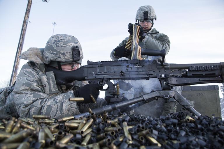 Keywords: m240b machine gun m240bmachinegun 673rd security forces squadron 673rdsecurityforcessquadron live fire livefire joint base elmendorf-richardson jointbaseelmendorfrichardson alaska united states unitedstates us outdoor U.S. Air Force Senior Airman Kevin Kelly, left, and Airman 1st Class Isaiah McKee, both installation entry controllers assigned to the 673rd Security Forces Squadron, operate a M240B machine gun during live fire training at Grezelka range, Joint Base Elmendorf-Richardson, Alaska, Oct. 27, 2016. The security forces Airmen fired M240B machine guns to hone their proficiency. Kelly and McKee are natives of Chepachet, R.I. and Columbus, Ohio, respectively. (U.S. Air Force photo/Alejandro Pena) U.S. Air Force Senior Airman Kevin Kelly, left, and Airman 1st Class Isaiah McKee, both installation entry controllers assigned to the 673rd Security Forces Squadron, operate a M240B machine gun during live fire training at Grezelka range, Joint Base Elmendorf-Richardson, Alaska, Oct. 27, 2016. The security forces Airmen fired M240B machine guns to hone their proficiency. Kelly and McKee are natives of Chepachet, R.I. and Columbus, Ohio, respectively. (U.S. Air Force photo/Alejandro Pena) |