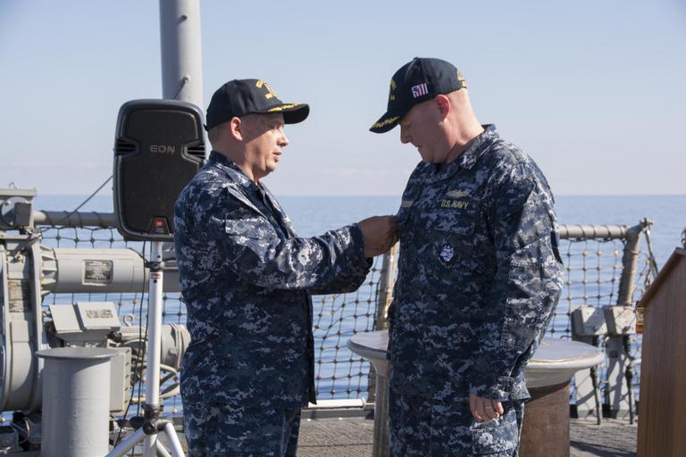 | Keywords: uss carney (ddg 64); 6th fleet; uss carney change-of-command usscarneyddg646thfleetusscarneychangeofcommand mediterranean sea mediterraneansea outdoor 161105-N-N0901-118 MEDITERRANEAN SEA (Nov 5, 2016) - Cmdr. Ken Pickard, left, pins a command-at-sea pin on Cmdr. Pete Halvorsen, commanding officer, USS Carney (DDG 64) during a change of command ceremony aboard aboard USS Carney Nov. 5, 2016. Carney, an Arleigh Burke-class guided-missile destroyer, forward-deployed to Rota, Spain, is conducting a routine patrol in the U.S. 6th fleet area of operations in support of U.S. national security interests in Europe. (U.S. Navy photo by Petty Officer 2nd Class Alex Walsh/Released) 161105-N-N0901-118 MEDITERRANEAN SEA (Nov 5, 2016) - Cmdr. Ken Pickard, left, pins a command-at-sea pin on Cmdr. Pete Halvorsen, commanding officer, USS Carney (DDG 64) during a change of command ceremony aboard aboard USS Carney Nov. 5, 2016. Carney, an Arleigh Burke-class guided-missile destroyer, forward-deployed to Rota, Spain, is conducting a routine patrol in the U.S. 6th fleet area of operations in support of U.S. national security interests in Europe. (U.S. Navy photo by Petty Officer 2nd Class Alex Walsh/Released) |