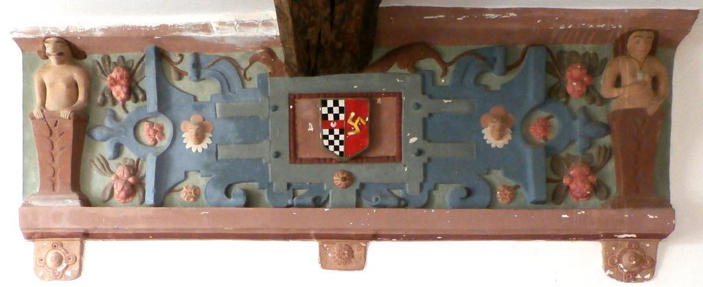 | Keywords: 1615 Overmantel HawkridgeBarton Chittlehampton Devon.PNG en 1615 plaster strapwork overmantel in the Inner Room next to the Great Hall in Hawkridge Barton Chittlehampton Devon showing the arms of Acland Chequy argent and sable a fesse gules impaling Tremayne Gules three dexter arms conjoined at the shoulders and flexed in triangle or the fists clenched argent representing the 1615 marriage of Baldwin II Acland 1593-1659 and Elizabeth Tremayne It consists of a strapwork cartouche with small heads probably of Cain and Abel to each side flanked by foliage and figures of Adam and Eve with the serpent above Listed building text own photo Lobsterthermidor <span class signature-talk ></span> 17 49 6 May 2015 UTC photo 2014 Overmantels Acland arms Tremayne arms Hawkridge Chittlehampton Strapwork |