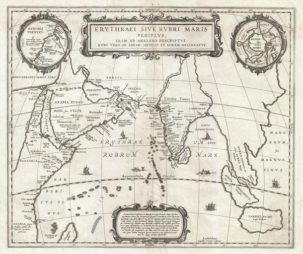 | Keywords: 1658 Jansson Map of the Indian Ocean (Erythrean Sea) in Antiquity - Geographicus - ErythraeanSea-jansson-1658.jpg Artwork of the region heavily on records from Alexander the Great's conquests Two smaller maps in the upper left and right quadrants are of exceptional interest The upper left chart shows northwestern Africa and is titled Annonis Periplus This is a reference to the legendary expeditions of the Carthaginian King Hanno said to have been the first to access the Indian Ocean by sailing around the southern tip of Africa Incidentally en route he is also said to have been the first to tame a lion The upper right chart shows the northern polar regions as they were perceived at the time A landmass covering the polar ice cap is indentified as Hyperborea To the left of this roughly where North America rests today the island of Atlantis appears; while Scythia Europe Thule and Asia are on the right Greenland and possibly Iceland appear at the bottom This map is intended to point out the possibility of a Northeast Passage to Asia which was at the time being actively sought after by Dutch English and Russian navigators Both smaller maps the primary title area at top center and an Latin explanation for the map at bottom center are surrounded by baroque strapwork style borders This remarkable map was published in volume six the Orbis Antiquus of Jan Jansson's Novus Atlas 1658 undated Size in 19 16 object history credit line accession number ErythraeanSea-jansson-1658 Jansson J <i>Novus Atlas Sive Theatrum Orbis Terrarum In quo Orbis Antiquus Seu Geographia Vetus Sacra Profana exhibetur</i> Volume 6 1658 Geographicus-source PD-old-100 Maps by Jan Jansson Old maps of the Indian Subcontinent Old maps of the Arctic 1650s maps of Africa Maps in Latin Old maps of phantom islands Old maps of the Indian Ocean 1658 maps of India Periplus of the Erythraean Sea |