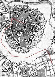 | Keywords: 1706-Wien-Marinoni-Transportweg Pummerin.jpg de Ungefährer Transportweg der alten Pummerin im Jahre 1711 Es wird berichtet vom Stadttor beim roten Turm Alle guten Quellen beziehen es auf die obere Fallen / das Fischertor Es hat einen einzelnen breiteren Bogen die untere Fallen das spätere neue Rotenturmtor dagegen zwei Es wird auch berichtet dass schon lange Zeit vorher ein Handwerker den Auftrag erhielt alle Gewölbe vom Roten Turm später altes Rotenturmtor bis zum Stephansdom zu kontrollieren und notfalls zu verstärken <br/>Es bestünde noch die kleine Möglichkeit dass etwas in der Linie der mittelalterlichen Stadtmauer abgebrochen worden wäre was auch 1710 noch nicht im Plan verzeichnet ist und der geplante Weg geändert wurde dann hätte man nicht durch den roten Turm müssen Das ist mit den zwei kleinen Abzweigern angedeutet <br/>Die Werstatt ist absolut im richtigen Rechteck knapp oberhalb der Ulrichskirche <br/><br/>Ausschnitt aus Grundrissplan von Wien mit seinen Vorstädten und dem Linienwall 1704 1706 gestochen und gedruckt Kupferstich Maßstab 1 5400 Ausrichtung nach Ostsüdost Erster exakter Plan von Wien der auch sämtliche Vorstädte umfasste http //www wien gv at/kultur/kulturgut/karten/marinoni/index html ; Wiener Stadt- und Landesarchiv Kartographische Sammlung At 41 Leander Anguissola Johann Jacob Marinoni etc 1706 thumb PD-old-100 ImageNote 1 323 269 41 63 770 1081 2 Stephansdom - Zielort ImageNoteEnd 1 ImageNote 2 153 247 34 29 770 1081 2 Der Rote Turm mit dem verteidigungstechnisch wertlosen alten Rotenturmtor ImageNoteEnd 2 ImageNote 3 153 184 22 34 770 1081 2 Die untere Fallen und spätere neue Rotenturmtor ImageNoteEnd 3 ImageNote 4 5 188 119 117 770 1081 2 Unterer Werd / Leopoldstadt ImageNoteEnd 4 ImageNote 5 121 182 32 23 770 1081 2 Schlagbrücke ImageNoteEnd 5 ImageNote 6 146 337 20 20 770 1081 2 obere Fallen späteres Fischertor ImageNoteEnd 6 ImageNote 7 664 812 22 27 770 1081 2 St Ulrich ImageNoteEnd 7 ImageNote 8 725 859 43 34 770 1081 2 Wendelstadt später Burggasse 55 und Stuckgasse; Werkstadt und Ausgangsort ImageNoteEnd 8 ImageNote 9 539 1036 90 42 770 1081 2 Lerchenfeld ImageNoteEnd 9 ImageNote 10 135 14 590 42 770 1081 2 Wienfluß ImageNoteEnd 10 ImageNote 11 420 466 60 115 770 1081 2 Burg ImageNoteEnd 11 ImageNote 12 207 626 41 45 770 1081 2 Schottentor ImageNoteEnd 12 ImageNote 13 561 291 49 43 770 1081 2 Kärntnertor ImageNoteEnd 13 ImageNote 14 465 550 56 69 770 1081 2 Burgtor ImageNoteEnd 14 ImageNote 15 310 83 45 56 770 1081 2 Stubentor ImageNoteEnd 15 Pummerin |