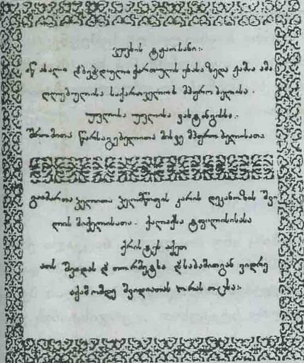 | Keywords: 1712 წელს დაბეჭდილი ვეფხისტყაოსნის თავფურცელი.jpg ka 1712 წელს დაბეჭდილი ვეფხისტყა ს ს თავფურცელი http //publish dlf ge/vaxtangvi/antonpirveli/vepxist1712 jpg publish dlf ge author 1712 80px The Knight in the Panther's Skin 1712 in Tbilisi Mkhedruli book pages Source http //publish dlf ge/vaxtangvi/antonpirveli/galerea html publish dlf ge PD-old-100 |