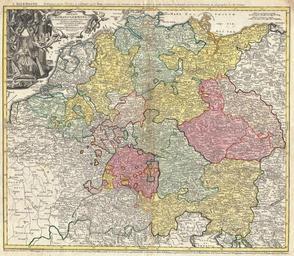 Keywords: 1740 Homann Map of the Holy Roman Empire ( Germanic Empire ) - Geographicus - ImperiiRomanoGerman-homann-1740.jpg A beautifully detailed c 1740 J B Homann map of those parts of Europe dominated by the Holy Roman Empire or the German Empire Depicts most of central Europe from the Netherlands eastward as far as Poland and Hungary and as far south as northern Italy and the Gulf of Venice Elaborate title cartouche in the upper left quadrant features the Emperor surrounded by angels and heraldic symbols Map scales in upper right hand quadrant Key to color coding outside border on lower margin Alternative title in French in top margin L ™ Allemagne distinguee en ses Cercles subdivisee en ses Etats contenant los Elements de Geographiae de Mr Shatz This map was drawn in Nuremberg by J B Homann and included in the 1752 Homann Heirs Maior Atlas Scholasticus ex Triginta Sex Generalibus et Specialibus ¦ circa 1720 undated Size in 21 18 75 object history credit line accession number ImperiiRomanoGerman-homann-1740 <i>Major Atlas Scholasticus Ex Triginta sex Generalibus et Specialibus Mappis Homannianis </i> c 1730 / Also issued in Homann's <i>Grosser Atlas</i> Geographicus-source PD-old-100 Johann Baptist Homann Old maps of the Holy Roman Empire 1740 maps Maps in Latin |