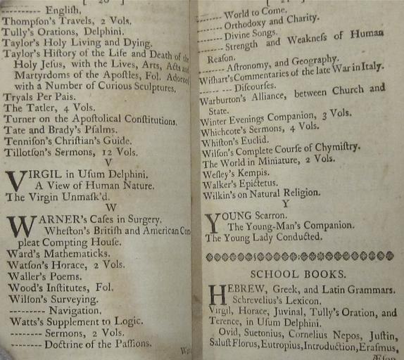 Keywords: 1755 GarratNoel NY BostonPublicLibrary p18.jpg From A catalogue of books in history divinity law arts and sciences and the several parts of polite literature to be sold by Garrat Noel bookseller in Dock-Street New York New-York Printed by H Gaine in Queen-Street between the Fly and Meal-Markets 1755 24 p ; 16 cm Courtesy of the Trustees of the Boston Public Library/Rare Books 1755 Printed by H Gaine PD-old-100 Garrat Noel |