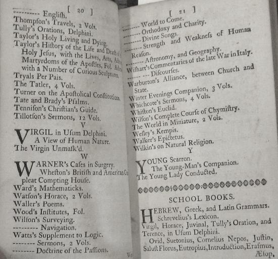 Keywords: 1755 GarratNoel NY BostonPublicLibrary p20.jpg From A catalogue of books in history divinity law arts and sciences and the several parts of polite literature to be sold by Garrat Noel bookseller in Dock-Street New York New-York Printed by H Gaine in Queen-Street between the Fly and Meal-Markets 1755 24 p ; 16 cm Courtesy of the Trustees of the Boston Public Library/Rare Books 1755 Printed by H Gaine PD-old-100 Garrat Noel |