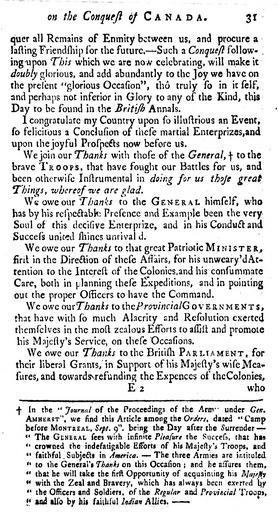 | Keywords: 1760 Canada Surrender p31 byThomasFoxcroft Boston.jpg  Grateful reflexions on the signal appearances of divine providence for Great Britain and its colonies in America which diffuse a general joy A sermon preached in the Old Church in Boston October 9 1760 Being the thanksgiving-day on occasion of the surrender of Montreal and the complete conquest of Canada by the blessing of heaven on his Britannic Majesty's brave troops under the auspicious conduct of that truly great and amiable commander General Amherst By Thomas Foxcroft A M One of the Pastors of the said Church Early American Imprints Series 1 1760 Thomas Foxcroft PD-old-100 Thomas Foxcroft French and Indian War Samuel Kneeland Surrendering |