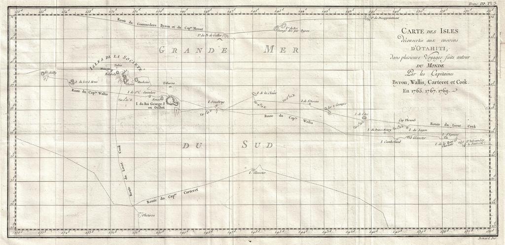 | Keywords: 1769 Cook Map of Tahiti, the Society Islands, and the Vicinity - Geographicus - OtahitiDecouverts-cook-1769.jpg This is a fine map shows the explorations of Captain Cook Captain Byron Captain Wallis and Captain Carteret in the vicinity of Tahiti and the Society Islands from 1765 to 1769 Extends from Is Scilly i e the Scilly Islands in the west and to I Whitsunday de la Pentecote i e the Whitsunday Island in the east from Is du Disappointment i e Disappointment Island in the north to Ohetiroa in the south Features the routes taken by these important explorers as the zig-zagged in and around the Society Islands Depicts the island of Tahiti Otaheite as well as Bora Bora Bolabola Otaha Marma Ulietea and others Title in decorative script in the upper right quadrant Engraved by Bernard for the 1774 Paris edition of John Hawkesworth ™s Account of the Voyages ¦ in which this was contained as Plate 3 in Volume III 1769 dated Size in 21 10 object history credit line accession number OtahitiDecouverts-cook-1769 <i>Relation des voyages entrepris par ordre de sa MajestĂ© Britannique actuellement rĂ©gnante pour faire des dĂ©couvertes dans l'hĂ©misphère mĂ©ridional et successivement exĂ©cutĂ©s par le commodore Byron le capitaine Carteret le capitaine Wallis et le capitaine Cook dans les vaisseaux le Dauphin le Swallow and l'Endeavour </i> 1774 first Saillant and Nyon French edition Geographicus-source PD-Art-100 Maps of the Society Islands James Cook maps relating to Samuel Wallis John Byron Philip Carteret Maps of voyages Old nautical charts Old maps showing history of Oceania Old maps of Polynesia 1769 maps French language maps of the Pacific Ocean |
