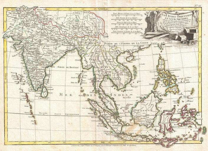 | Keywords: 1770 Bonne Map of India, Southeast Asia ^ The East Indies (Thailand, Borneo, Singapore) - Geographicus - SoutheastAsia-bonne-1770.jpg A beautiful example of Rigobert Bonne's c 1770 map of India Southeast Asia and the East Indies Covers from Kandahar and the Maldives in the west eastward to include all of India Southeast Asia modern Burma Thailand or Siam Malaysia Cambodia Vietnam Laos the East Indies Java Sumatra Borneo and the Celebes and the Philippines Also includes much of Tibet Identifies countless cities rivers waterways and states throughout the region Names the Straight Singapore as Sin Capura Vietnam is divided into the kingdoms fo Tonkin and Chochinchine Includes the Tip of Formosa or Taiwan Drawn by R Bonne c 1770 for issue as plate no 26 in Jean Lattre's 1776 issue of the Atlas Moderne 1770 undated Size in 18 12 5 object history credit line accession number SoutheastAsia-bonne-1770 Lattre Jean <i>Atlas Moderne ou Collection de Cartes sur Toutes les Parties du Globe Terrestre</i> c 1775 Geographicus-source PD-old-100 Old maps of Southeast Asia 1770 maps Asia in the 1770s Burma in the 18th century India in the 1770s Indonesia in the 18th century Thailand in the 18th century Maps in French |