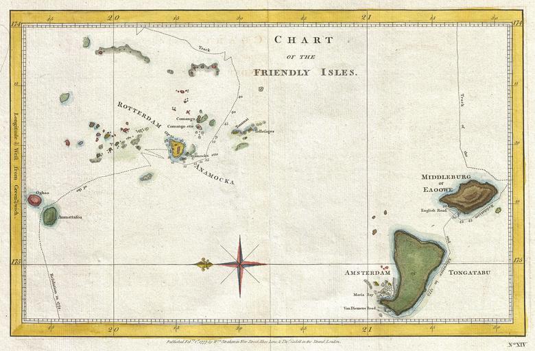 Keywords: 1777 Cook Map of the Friendly Islands or Tonga - Geographicus - FriendlyIsles-cook-1777.jpg A highly uncommon chart of the Friendly Islands or Tonga from 1777 Oriented to the East this map depicts the Tongatapu Island Group and the Ha'Apai Group that make up the Kingdom of Tonga Shows the routes of the Resolution and the Adventure on Captain Cook's second voyage 1772-1774 Cook's second voyage was intended to discover the apocryphal Terra Australis a theoretical southern continent that is not to be confused with Australia or Antarctica On this voyage Cook crossed the Antarctic Circle and nearly but not quite spotted the Antarctic mainland He landed at the Friendly Islands and laid on this map on the return portion of his voyage in 1773 and 1774 Published in 1777 by Thomas Cadell of London 1777 dated Size in 13 8 5 object history credit line accession number FriendlyIsles-cook-1777 Cook James <i>A Voyage towards the South Pole and Tound the World Performed in His Majesty's ships the Resolution and Adventure in the years 1772 1773 1774 and 1775</i> 2nd edition London Printed for W Strahan; and T Cadell in the Strand 1777 Geographicus-source PD-Art-100 1777 maps Old maps of Tonga Maps in English Old nautical charts James Cook maps relating to Maps of voyages |