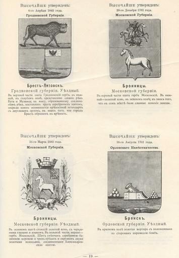 Keywords: Брест Бронницы 1781 1883 Брянск из Винклера.jpg Official Russian Empire coats of arms Ге бы го одов Российской Импе ии Б ест-Литовск Б онницы Б янск с официальными описаниями в Ге бовнике Винкле а П П фон-Винкле Ге бы го одов губе ний областей и посадов Российской Импе ии внесенные в Полное Соб ание законов с 1649 по 1900 год Дозволено цензу ою С -Пете бу г 20 Июля 1899 года Издание книгото говца Ив Ив Иванова С -Пете бу г Типог афия И Комелова П яжка д 3 1899 \ Scanned by Vizu 1899 published П П фон Винкле \ Pavel von Vinkler PD-old PD-RusEmpire PD-RU-exempt coats of arms Gerbovnik Vinklera - Pages 019 Symbols of Brest Belarus Coats of arms of Bryansk |