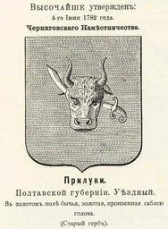 | Keywords: Прилуки 1782 из Винклера.jpg Official Russian Empire Priluki coat of arms Ге б уездного го ода П илуки Полтавской губе нии в 1782 - Че ниговского наместничества Российской Импе ии с официальным описанием в Ге бовнике Павла Пет овича Винкле а П П фон-Винкле Ге бы го одов губе ний областей и посадов Российской Импе ии внесенные в Полное Соб ание законов с 1649 по 1900 год Дозволено цензу ою С -Пете бу г 20 Июля 1899 года Издание книгото говца Ив Ив Иванова С -Пете бу г Типог афия И Комелова П яжка д 3 1899 / Scanned 1782 / 1899 published П П фон Винкле / Pavel von Vinkler PD-old PD-RusEmpire PD-RU-exempt coats of arms Gerbovnik Vinklera - City CoAs Coats of arms of Poltava Governorate Buffalo in heraldry Sabres in heraldry |
