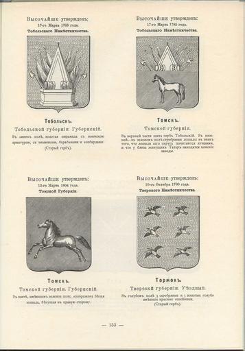 | Keywords: Тобольск Томск 1785 1804 Торжок из Винклера.jpg  Official Russian Empire coats of arms Ге бы го одов Российской Импе ии Тобольск Томск То жок - с официальным описанием в Ге бовнике Винкле а П П фон-Винкле Ге бы го одов губе ний областей и посадов Российской Импе ии внесенные в Полное Соб ание законов с 1649 по 1900 год Дозволено цензу ою С -Пете бу г 20 Июля 1899 года Издание книгото говца Ив Ив Иванова С -Пете бу г Типог афия И  Комелова П яжка д 3 1899 \ Scanned by Vizu 1780\ 1785\ 1804\ 1899 published П П фон Винкле \ Pavel von Vinkler PD-old PD-RusEmpire PD-RU-exempt coats of arms Gerbovnik Vinklera - Pages 153 Coats of arms of Tobolsk Governorate Tobolsk Coats of arms of Tomsk Governorate Tomsk |