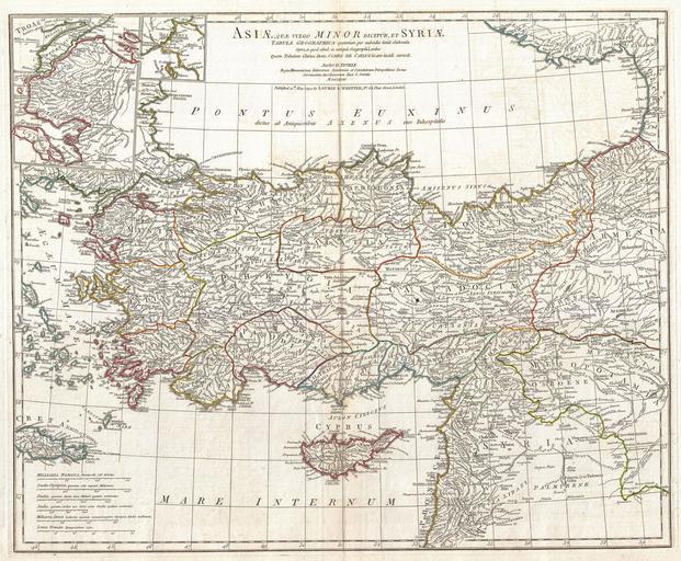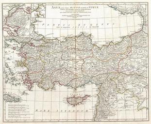 | Keywords: 1794 Anville Map of Asia Minor in Antiquity (Turkey,Cyprus, Syria) - Geographicus - AsiaMinor-anville-1794.jpg  A large and dramatic J B B D'Anville map of Asia Minor in antiquity Covers from Greece Graecia and the Aegean Sea eastward to include all of Asia Minor as far as Armenia Extends south as far as the ancient city of Sidon in modern day Lebanon Includes the modern day nations of Turkey Syria Cyprus and Lebanon along with parts of adjacent Greece and Armenia Details mountains rivers cities roadways and lakes with political divisions highlighted in outline color Title area appears at top center Includes six distance scales bottom left referencing various measurement systems common in antiquity Text in Latin and English Drawn by J B B D'Anville in 1764 and published in 1794 by Laurie and Whittle London 1764 dated ; published 1794 Size in 24 5 20 object history credit line accession number AsiaMinor-anville-1794 D'Anville J B B <i>Complete Body of Ancient Geography</i> Laurie and Whittle London 1795 Geographicus-source PD-old-100 Old maps of the Black Sea 1764 maps Old maps of Turkey Old maps of Syria Old maps of Armenia Old maps of Cyprus 18th-century maps of Georgia Maps of ancient Anatolia Maps in Latin |