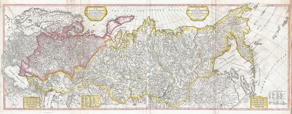 | Keywords: 1794 Laurie and Whittle Wall Map of Russia - Geographicus - Russia-lauriewhittle-1794.jpg An rare and magnificently proportioned 1794 wall map of the Russian Empire by Laurie and Whittle Extends from the North Sea and the Black Sea eastward as far as Siberia and the Behring Strait Extends south to China and the Aral Sea and north to include the island of Nova Zembla and the Arctic Color coded according to region with Russia in Europe toned in reds and pinks and Russia in Asia in yellows and greens This map is most interesting in its extreme eastern portions which when this map was drawn had only recently been explored The explorations of Vitus Behring are very much in evidence with regard to the form of Kamtschatka and the extreme northeast of Siberia Shows variosu nautical routes from Okotskoi Ostrog in Siberia ccross the Sea of Okotsk to Kamtschatka and the Kuril Islands Sakhalin is curiously divided into two separate islands Hokkaido appears as Matmay or Atkis Identifies Behring Island off the coast of Kamtschatka where the great Arctic navigator ultimately met his doom Published by Laurie and Whittle as plate no 25 in the 1797 edition of Thomas Kitchin's General Atlas 1794 dated Size in 51 19 object history credit line accession number Russia-lauriewhittle-1794 Kitchin Thomas <i>Kitchin's General Atlas describing the Whole Universe being a complete collection of the most approved maps extant; corrected with the greatest care and augmented from the last edition of D'Anville and Robert with many improvements by other eminent geographers engraved on Sixty-Two plates comprising Thirty Seven maps </i> Laurie Whittle London 1797 Geographicus-source PD-Art-100 Old maps of the Russian Empire 1794 maps Maps in English |