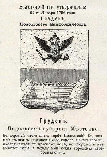 | Keywords: Грудек 1796 из Винклера.jpg Official Russian Empire coat of arms Grudek Ге б Российской Импе ии местечка Г удек Подольской губе нии с официальным описанием в Ге бовнике Винкле а П П фон-Винкле Ге бы го одов губе ний областей и посадов Российской Импе ии внесенные в Полное Соб ание законов с 1649 по 1900 год Дозволено цензу ою С -Пете бу г 20 Июля 1899 года Издание книгото говца Ив Ив Иванова С -Пете бу г Типог афия И Комелова П яжка д 3 1899 \ Scanned 1796 \ 1899 published П П фон Винкле \ Pavel von Vinkler PD-old PD-RusEmpire PD-RU-exempt coats of arms Gerbovnik Vinklera - City CoAs Coats of arms of cities in Podolia Governorate Russian canting arms Walls in heraldry |