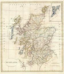 | Keywords: 1799 Clement Cruttwell Map of Scotland - Geographicus - Scotland-cruttwell-1799.jpg A fine 1799 map of Scotland by the English map publisher Clement Cruttwell Covers the entire region in great detail including a detailed inset of the Shetland Isles Here all the counties are labeled as Shires as the word county did not become common usage in Scotland until the nineteenth century In the north are Caithness Sutherland Ross Murray Aberdeen and Bamff Shires With the exception of the merger of Ross Shire and Cromarty Shire these counties are still in existence today In central Scotland are the Inverness Shire Kincardine Shire Angus Shire Argyle Shire Fife Shire and Perth Shire Further south are the Shires of Renfew Dumbarton Edinburgh Haddington Berwick Lanerk Air Kirkudbright Dumfries Selkirk and Roxburgh Lewis Island in the North is attached to Rofs Shire South of Lewis Island is North and South Uist Island and Coll Island which retained baronial fief by the Macleans of Coll until 1848 In the northeast are the Shetland Islands which did not officially become a part of Scotland until a Scottish Act of Parliament in 1669 The map is highly detailed including many roads river ways ports towns and shoals Outline color and fine copper plate engraving in the minimalist English style prevalent in the late 18th and early 19th centuries Mountains and other topographical detail shown by profile Drawn by G G and J Robinson of Paternoster Row London for Clement Cruttwell's 1799 Atlas to Cruttwell's Gazetteer 1799 dated size in 14 16 object history credit line accession number Scotland-cruttwell-1799 Cruttwell C <i>Atlas to Cruttwell's Gazetteer</i> 1799 Geographicus-source PD-Art-100 Old maps of Scotland 1799 maps Maps by Clement Cruttwell English language maps of Europe |