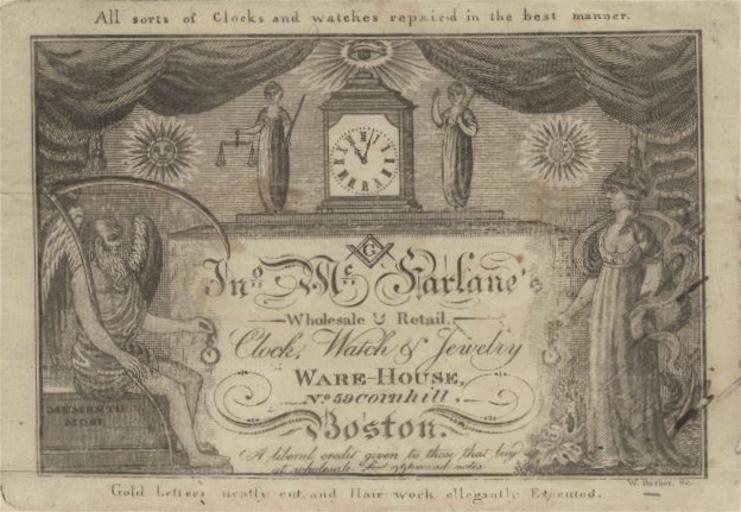 | Keywords: 1812 McFarlane Boston.png  en All sorts of clocks and watches repaired in the best manner Jn S McFarlane's wholesale retail clock watch jewelry ware-house no 59 Cornhill Boston 1812 American Broadsides and Ephemera Series 1 McFarlane 1812 Boston in the 1810s Shops in Boston PD-old-100 |