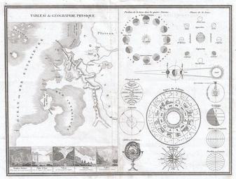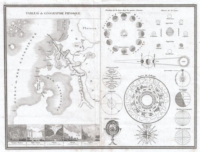 Keywords: 1838 Monin Map or Physical Tableau and Astronomy Chart (Zodiac) - Geographicus - Tableau-monin-1838.jpg Artwork fr Légendes Tableau de géographie physique “ Trombes Marines “ Chûte d ™Eau “ Volcan “ Glacier “ Vallée “ Position de la terre dans les quatre Saisons “ Phases de la Lune “ Zônes et cercles “ Antipodes “ Signes du Zodiaque “ Sphère Armillaire “ Rose des vents “ Axe de la terre et écliptique “ Méridiens ou Longitudes “ Parallèles ou Latitudes en This is a very unusual 1838 map and astronomical chart by M Monin Divided into two sections The left section is a Geographical Tableau essentially a map of nothing showing various geographical features and how they can be displayed Shows mountains plains gulfs seas archipelagos swamps lakes rivers and plateaus among others Along the bottom there are five engraved images of geographical sights and events including tornadoes at sea a waterfall a volcano erupting a glacier and a valley The right side of this map is a Astronomical chart itself divided into various elements Includes a diagram of the seasons a map of the phases of the moon a representation of the Zodiac a lunar and solar eclipse diagram an Armillary sphere etc ¦ Prepared by M Monin as plate no 1838 undated Size in 14 10 5 object history credit line accession number Tableau-monin-1838 <i>Atlas Classique de La Geographie Ancienne du Moyen Age et Moderne a L'Usage des Colleges et des Pensiones pour servir a L'Etude de La Geographie et de L'Histoire corrige et augemnte Par M Monin ingenieur-Geographe membre de la Societe de Geographie <i> 1838 edition Geographicus-source PD-art Charles V Monin Map elements Armillary spheres Seasons on Earth Lunar phase diagrams Eclipse Zodiac diagrams Compass roses on maps Astronomical diagrams Latitudes Longitudes 1838 engravings Diagrams in French