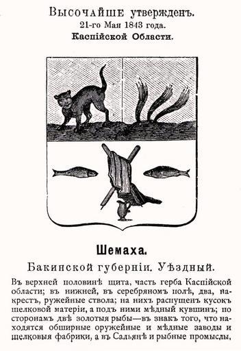 | Keywords: Шемаха 1843 из Винклера.jpg Official Russian Empire coat of arms Shemaha Ге б Российской Импе ии уездного го ода Шемаха Бакинской губе нии в 1843 - админист ативного цент а Каспийской области с официальным описанием в Ге бовнике Винкле а П П фон-Винкле Ге бы го одов губе ний областей и посадов Российской Импе ии внесенные в Полное Соб ание законов с 1649 по 1900 год Дозволено цензу ою С -Пете бу г 20 Июля 1899 года Издание книгото говца Ив Ив Иванова С -Пете бу г Типог афия И Комелова П яжка д 3 1899 \ Scanned by Vizu 1843 \ 1899 published П П фон Винкле \ Pavel von Vinkler PD-old PD-RusEmpire PD-RU-exempt coats of arms BadJPEG Gerbovnik Vinklera - City CoAs Coats of arms of Baku Governorate Kaspii Oblast Coats of arms of Shamakhi Fish in heraldry |