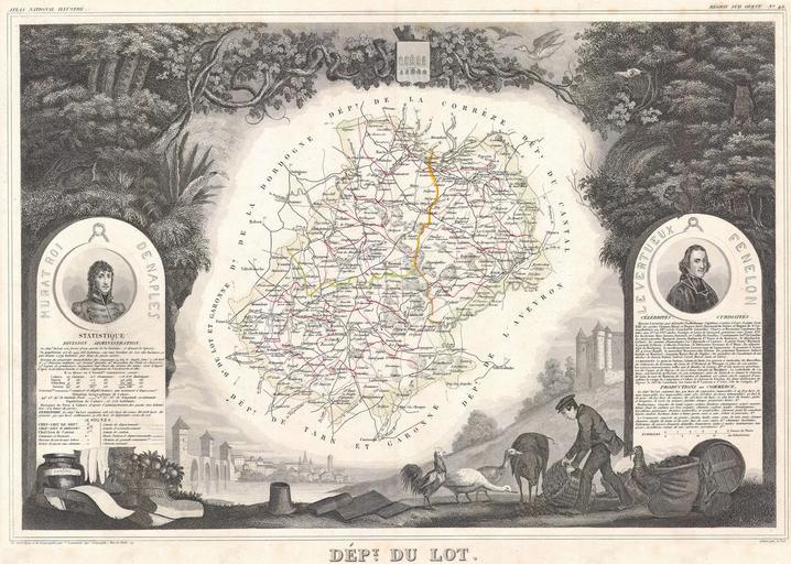 Keywords: 1847 Levasseur Map of the Dept. Du Lot, France - Geographicus - Lot-levasseur-1847.jpg This is a fascinating 1847 map of the Department du Lot France This region is known for its agriculture distilled spirits wines and fine hunting The capital is Cahors Cahors wines are rich reds excellent with duck This area is also an important stopping point on the historic Chemin du St Jacques or the mediaeval pilgrimage route to Santiago de Compostella The whole is surrounded by elaborate decorative engravings designed to illustrate both the natural beauty and trade richness of the land There is a short textual history of the regions depicted on both the left and right sides of the map 1847 Size in 17 5 12 5 object history credit line accession number Lot-levasseur-1847 Geographicus-source PD-old-100 1847 maps France Old maps of Lot Coats of arms of cities in Lot Cahors Joachim Murat France François Fénelon France Engravings of animals Maps in French France Victor Levasseur - Maps of France France Animals on maps |