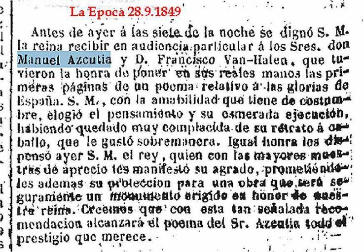 Keywords: 1849-Manuel-Azcutia-audiencia-particular.jpg es Antes de ayer a las siete de la noche se dignò S M La reina recibir en audencia particular a los Sres Don Manuel Azcutia y D Francisco Van-Halen que tuvieron la honra de poner en sus reales manos las primeras paginas de un poema relativo a las glorias de España S M con la amabilidad que tiene de costumbre elogiò el pensamiento y su esmerada ejecucion habiendo quedado muy complacida de su retrato a caballo que le gustò sobremanera Igual honra les dispenso ayer S M el rey quien con las mayores muestras de aprecio les manifestò su agrado prometiendoles ademas su proteccion para una obra que serà seguramente un monumento erigido en honor de nuestra reina Creemos que con esta tan señalada recomendacion alcanzaarà el poema del sr Azcuti todo el prestigio que merece 1849-09-28 La Epoca Madrid 28 9 1849 La Epoca other versions PD-old Uploaded with UploadWizard La Epoca Madrid Manuel Lopez de Azcutia 1849 in Madrid |