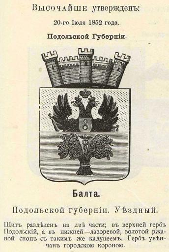 | Keywords: Балта 1852 из Винклера.jpg Official Russian Empire coat of arms Balta Ге б Российской Импе ии го ода уездного го ода Балта Подольской губе нии с официальным описанием в Ге бовнике Винкле а П П фон-Винкле Ге бы го одов губе ний областей и посадов Российской Импе ии внесенные в Полное Соб ание законов с 1649 по 1900 год Дозволено цензу ою С -Пете бу г 20 Июля 1899 года Издание книгото говца Ив Ив Иванова С -Пете бу г Типог афия И Комелова П яжка д 3 1899 \ Scanned paper book 1852 \ 1899 published П П фон Винкле \ Pavel von Vinkler PD-old PD-RusEmpire PD-RU-exempt coats of arms Gerbovnik Vinklera - City CoAs Coats of arms of cities in Podolia Governorate Coats of arms of Balta Odessa Oblast History of Balta Historical coats of arms of Odessa Oblast |
