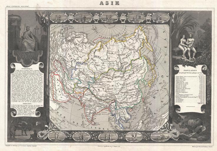 | Keywords: 1852 Levasseur Map of Asia - Geographicus - Asia-levasseur-1852.jpg A visually stunning decorative map of Asia dating to 1852 by French map publisher Victor Levasseur Covers the entire continent of Asia as well as parts adjacent parts Europe and Africa Shows the Chinese Empire including Tibet and Mongolia In Southeast Asia the Kingdoms of Annam Chochine Tonkin Siam and Burma are noted Singapore is identified Afghanistan is divided into the Kingdom of Kaboul the Kingdom of Heral and the Confederation of Belouchistan Several islands in the Russian Arctic including Nova Zembla and the New Siberia Islands are mapped vaguely Curiously Levasseur identifies one of the Japanese Kuril Islands as the land of Compagnie a semi-mythical island sought by many early explorers of this region including Behring and Cook By far this map's most striking feature is its elaborate allegorical border work Levasseur composed this map for publication in his magnificent Atlas Nacionale de la France Illustree one of the most decorative and beautifully produced atlases to appear in the 19th century This particular map is surrounded on all sides with elaborate allegorical border work Surrounding the map are ten medallions intended to represent life in Asia - though most of the these seem to focus on India at the time the most known of Asian lands To the left of the map proper is an enthroned woman a most likely representation of Hesione the wife of Prometheus who is commonly associated with Asia Curiously the figure holds a main de justice a kind of scepter with a hand of benediction on top it her right hand The main de justice was initially a symbol of royal French power and in this case is a possible reference to the French claims to Indochina Right of the map Adam and Eve are drawn relaxing in Eden with a benevolent God figure looking on As with most Levasseur depictions of god his halo is pyramidal a possibly Masonic reference Levassuer's choice to add Adam and Eve to this map is a reference to mediaeval beliefs that Eden lay in the seas beyond Asia Various exotic animals including a bear a buffalo an rhino a tiger and an crocodile appear at the bottom of the map Publised by V Levasseur in the 1852 edition of his Atlas National de la France Illustree 1852 undated Size in 16 5 12 5 object history credit line accession number Asia-levasseur-1852 Levassuer V <i>Atlas National Illustre des 86 Departements et des Possessions de La France Divise par Arrondissements Cantons et Communea avec La Trace de Toutes Les Routes Chemins de fer et Canaux </i> 1852 edition Geographicus-source PD-art Old maps of Asia Oceanids Hesione Engravings of Adam and Eve 1852 maps Maps in French Victor Levasseur - Maps of the world Main de justice in art Animals on maps Water buffaloes in art in Thailand |