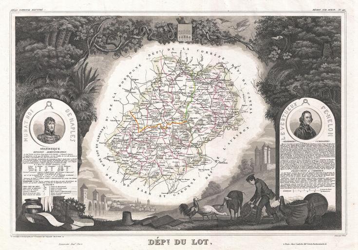 Keywords: 1852 Levasseur Map of the Department Du Lot, France (Cahors Wine Region) - Geographicus - Lot-levasseur-1852.jpg This is a fascinating 1852 map of the French department of Lot France This area of France is known for its production of Cahors wine a powerful red wine often harsh when young but remarkable after a few years in bottle The Pilgrimage to Santiago de Compostella also passes through the northern part of this region The map proper is surrounded by elaborate decorative engravings designed to illustrate both the natural beauty and trade richness of the land There is a short textual history of the regions depicted on both the left and right sides of the map Published by V Levasseur in the 1852 edition of his Atlas National de la France Illustree 1852 undated Size in 17 5 12 object history credit line accession number Lot-levasseur-1852 Levassuer V <i>Atlas National Illustre des 86 Departements et des Possessions de La France Divise par Arrondissements Cantons et Communea avec La Trace de Toutes Les Routes Chemins de fer et Canaux </i> 1852 edition Geographicus-source PD-old-100 Victor Levasseur - Maps of France France 1852 maps France Old maps of Lot |