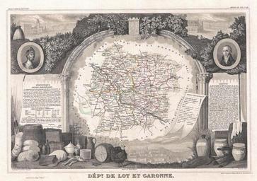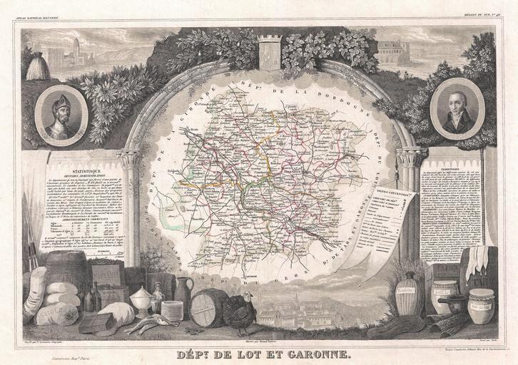 Keywords: 1852 Levasseur Map of the Department De Lot et Garonne, France - Geographicus - LotEtGaronne-levasseur-1852.jpg This is a fascinating 1852 map of the French department of Lot et Garonne France This area of France is known for its production of Buzet wines and CabĂ©cou d ™Antan small round goat cheese with a fine creamy texture The Pilgrimage to Santiago de Compostella also passes through the northern part of this region The map proper is surrounded by elaborate decorative engravings designed to illustrate both the natural beauty and trade richness of the land There is a short textual history of the regions depicted on both the left and right sides of the map Published by V Levasseur in the 1852 edition of his Atlas National de la France Illustree 1852 undated Size in 17 12 object history credit line accession number LotEtGaronne-levasseur-1852 Levassuer V <i>Atlas National Illustre des 86 Departements et des Possessions de La France Divise par Arrondissements Cantons et Communea avec La Trace de Toutes Les Routes Chemins de fer et Canaux </i> 1852 edition Geographicus-source PD-old-100 1852 maps France Old maps of Lot-et-Garonne Maps in French France Agen coat of arms Blaise de Monluc Bernard Germain de LacĂ©pède Victor Levasseur - Maps of France France |