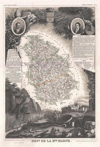 | Keywords: 1852 Levasseur Map of the Department De La Haute Marne, France (Champagne Wine Region) - Geographicus - HauteMarne-levasseur-1852.jpg This is a fascinating 1852 map of the French department of Haute Marne France This department is part of the Champagne region where the world-famous sparkling wine of the same name is produced This area is known for a variety of wines from the Coiffy-le-Haut vineyard champagne from Rizaucourt-Argentolles and the local favorite 'Choue' beer It is also famous for its production of Langres a salty cheese with a pronounced odor The map proper is surrounded by elaborate decorative engravings designed to illustrate both the natural beauty and trade richness of the land There is a short textual history of the regions depicted on both the left and right sides of the map Published by V Levasseur in the 1852 edition of his Atlas National de la France Illustree 1852 undated Size in 11 5 17 object history credit line accession number HauteMarne-levasseur-1852 Levassuer V <i>Atlas National Illustre des 86 Departements et des Possessions de La France Divise par Arrondissements Cantons et Communea avec La Trace de Toutes Les Routes Chemins de fer et Canaux </i> 1852 edition Geographicus-source PD-old-100 1852 maps France Old maps of Haute-Marne Images extracted from Encyclopédie France Victor Levasseur - Maps of France France |
