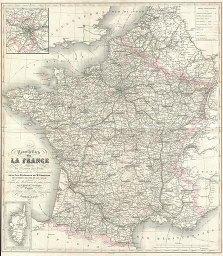 | Keywords: 1852 Levasseur Map of France - Geographicus - France-levasseur-1852.jpg This is a folio format map of France issued with Victor Levasseur's 1852 Atlas National Illustre Covers all of France as well as adjacent parts of Italy Span and England Shows all Departments as well as postal routes major cities rivers and roadways Indicates mileage between most towns Additionally shows ferry and shipping routes in the Mediterranean and in the English Channel An inset in the lower left quadrant focuses on Corsica A second inset in the upper left quadrant details the vicinity of Paris 1852 dated Size in 21 24 object history credit line accession number France-levasseur-1852 Levassuer V <i>Atlas National Illustre des 86 Departements et des Possessions de La France Divise par Arrondissements Cantons et Communea avec La Trace de Toutes Les Routes Chemins de fer et Canaux </i> 1852 edition Geographicus-source PD-old-100 Victor Levasseur - Maps of France Old maps of France 1852 maps Maps of Paris in the 19th century 19th-century maps of Paris Maps in French Postal route |