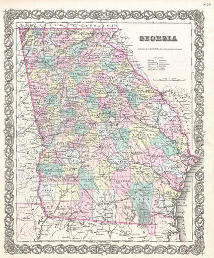 | Keywords: 1855 Colton Map of Georgia - Geographicus - Georgia-colton-1855.jpg A beautiful 1855 first edition example of Colton's map of Georgia Covers the entire state as well as adjacent parts of Florida and Alabama Like most of Colton's state maps this map is largely derived from an earlier wall map of North America produced by Colton and D Griffing Johnson Colton identifies various cities towns forts rivers rapids fords and an assortment of additional topographical details Map is hand colored in pink green yellow and blue pastels to define county and state boundaries Surrounded by Colton's typical spiral motif border Dated and copyrighted to J H Colton 1855 Published from Colton's 172 William Street Office in New York City Issued as page no 29 in volume 1 of the first edition of George Washington Colton's 1855 Atlas of the World 1855 dated Size in 13 16 object history credit line accession number Georgia-colton-1855 Colton G W <i>Colton's Atlas of the World Illustrating Physical and Political Geography</i> Vol 1 New York 1855 First Edition Geographicus-source PD-art Old maps of Georgia U S state 1855 maps |