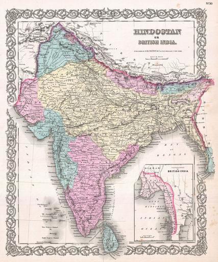 | Keywords: 1855 Colton Map of India - Geographicus - India-colton-1855.jpg A beautiful 1855 first edition example of Colton's map of India Covers the subcontinent from Tibet to Ceylon Sri Lanka Color coded according to region and divided into Bombay Scinde Punjab Nepal Bhutan the Bengal Presidency Madras and Ceylon An inset map in the lower right quadrant shows British claims in Burma Pegu and Southeast Asia Throughout Colton identifies various cities towns rivers and assortment of additional topographical details Surrounded by Colton's typical spiral motif border Dated and copyrighted to J H Colton 1855 Published from Colton's 172 William Street Office in New York City Issued as page no 30 in volume 2 of the first edition of George Washington Colton's 1855 Atlas of the World 1855 dated Size in 13 5 16 5 object history credit line accession number India-colton-1855 Colton G W <i>Colton's Atlas of the World Illustrating Physical and Political Geography</i> Vol 2 New York 1855 First Edition Geographicus-source PD-old-100 Maps by Joseph Hutchins Colton Old maps of the Indian Subcontinent 1855 maps of India |