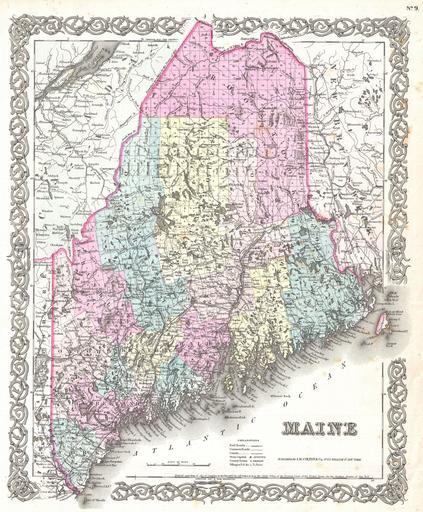 | Keywords: 1855 Colton Map of Maine - Geographicus - Maine-colton-1855.jpg A beautiful 1855 first edition example of Colton's map of Maine Covers the entire state as well as adjacent parts of Canada Like most of Colton's state maps this map is largely derived from an earlier wall map of North America produced by Colton and D Griffing Johnson Colton identifies various cities towns forts rivers rapids fords and an assortment of additional topographical details Map is hand colored in pink green yellow and blue pastels to define county and state boundaries Surrounded by Colton's typical spiral motif border Dated and copyrighted to J H Colton 1855 Published from Colton's 172 William Street Office in New York City Issued as page no 9 in volume 1 of the first edition of George Washington Colton's 1855 Atlas of the World 1855 dated Size in 13 16 object history credit line accession number Maine-colton-1855 Colton G W <i>Colton's Atlas of the World Illustrating Physical and Political Geography</i> Vol 1 New York 1855 First Edition Geographicus-source PD-old-100 Maps by Joseph Hutchins Colton Old maps of Maine 1855 maps |
