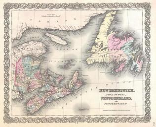 | Keywords: 1855 Colton Map of New Brunswick, Nova Scotia, Newfoundland and Price Edward Island - Geographicus - NovaScotia-colton-1855.jpg An excellent first edition example of Colton's rare 1855 map of the Maritime Provinces of New Brunswick Nova Scotia Newfoundland and Prince Edward Island Throughout the map Colton identifies various cities towns forts rivers rapids fords and an assortment of additional topographical details Map is hand colored in pink green yellow and blue pastels to define national and regional boundaries Surrounded by Colton's typical spiral motif border Dated and copyrighted to J H Colton 1855 Published as page no 4 in volume 1 of the first edition of George Washington Colton's 1855 Atlas of the World 1855 dated Size in 16 13 object history credit line accession number NovaScotia-colton-1855 Colton G W <i>Colton's Atlas of the World Illustrating Physical and Political Geography</i> Vol 1 New York 1855 First Edition Geographicus-source PD-old-100 Maps by Joseph Hutchins Colton Old maps of the Gulf of Saint Lawrence Old maps of New Brunswick Old maps of Nova Scotia Old maps of Newfoundland Old maps of Prince Edward Island 1855 maps of Canada |
