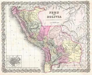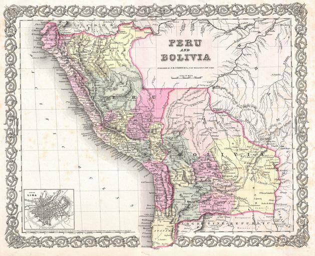 | Keywords: 1855 Colton Map of Peru and Bolivia - Geographicus - PeruBolivia-colton-1855.jpg An excellent first edition example of Colton's rare 1855 map Peru and Bolivia Covers from Ecuador to the Argentine Republic and from the Pacific to Brazil Shows Bolivia's claims to the Atacama desert and Peru's claims to Moquegua - both of which are today part of Chile An inset detail map of Lima Peru appears in the lower left quadrant Throughout the map Colton identifies various cities towns forts rivers rapids fords and an assortment of additional topographical details Map is hand colored in pink green yellow and blue pastels to define national and regional boundaries Surrounded by Colton's typical spiral motif border Dated and copyrighted to J H Colton 1855 Published as page no 60 in volume 1 of the first edition of George Washington Colton's 1855 Atlas of the World 1855 dated Size in 16 13 object history credit line accession number PeruBolivia-colton-1855 Colton G W <i>Colton's Atlas of the World Illustrating Physical and Political Geography</i> Vol 1 New York 1855 First Edition Geographicus-source PD-old-100 Maps by Joseph Hutchins Colton Old maps of Peru Old maps of Bolivia 1855 maps |