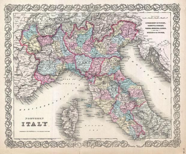 | Keywords: 1855 Colton's Map of Northern Italy and Corsica - Geographicus - ItalyNorth-colton-1855.jpg A beautiful 1855 first edition example of Colton's map of northern Italy Covers from Switzerland to the Gulf of Gaeta including the island of Corsica Includes Milan Genoa Parma Tuscany Venice Lombardy and the Papal States Throughout Colton identifies various cities towns forts rivers and assortment of additional topographical details Surrounded by Colton's typical spiral motif border Dated and copyrighted to J H Colton 1855 Published from Colton's 172 William Street Office in New York City Issued as page no 18 in volume 2 of the first edition of George Washington Colton's 1855 Atlas of the World 1855 dated Size in 16 13 5 object history credit line accession number ItalyNorth-colton-1855 Colton G W <i>Colton's Atlas of the World Illustrating Physical and Political Geography</i> Vol 2 New York 1855 First Edition Geographicus-source PD-old-100 Maps by Joseph Hutchins Colton Old maps of Italy 1855 |