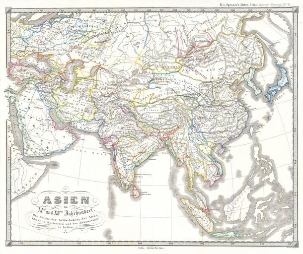 | Keywords: 1855 Spruner Map of Asia in the 11th and 12th Centuries ( Seljuk Empire, Song China ) - Geographicus - AsienXIXII-spruner-1855.jpg This fascinating hand colored map depicts Asia in the 11th and 12th centuries This period corresponds with the Song dynasty of China the rule of Altun Khan Daughter of Ghengis Khan in Mongolia and the Seljuk Turk Empire in Persia and Asia Minor All text is in German but the title roughly translates as Asia in the 11th and 12th century The realms of the Seljuk Turks; the Altun Khan in Mongolia and the Mohammudeans in India Map was originally part of the 1855 edition of Karl von Spruner ™s Historical Hand Atlas 1855 Size in 17 14 object history credit line accession number AsienXIXII-spruner-1855 Geographicus-source PD-old-100 Old maps of Asia |