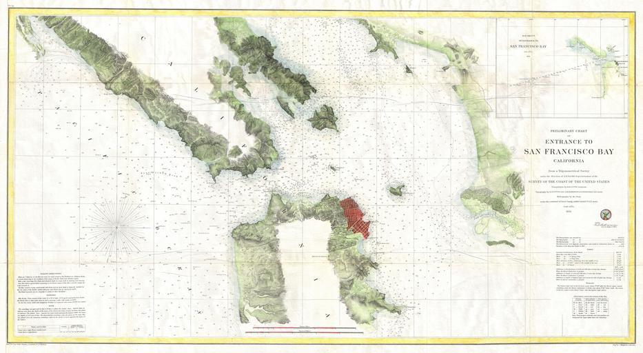 Keywords: 1856 U.S. Coast Survey Map of San Francisco Bay and City - Geographicus - SanFrancisco-uscs-1856.jpg A fine example of the 1856 U S Coast Survey chart of San Francisco Bay Covers the Golden Gate area the Marin Peninsula San Francisco Mission de Dolores and the eastern coastline from Brooks Island to San Antonio Creek Offers excellent inland detail noting mountain ranges fields swamps and occasionally individual buildings The early city layout and grid structure of San Francisco is clear Thousands of depth soundings throughout Sailing instructions in the lower left quadrant Tidal notations in the lower right quadrant In the upper right quadrant there is a sub-sketch of the entrance to San Francisco Bay The triangulation for this chart was prepared by R D CUtts The topography is the work of R D Cutts A M Harrison and A F Rodgers They Hydrography was accomplished by a party under the command of James Alden The entire chart was prepared under the supervision of A D Bache one of the most influential cartographers of his time 1856 dated Size in 38 20 5 object history credit line accession number SanFrancisco-uscs-1856 <i>Report of the Superintendant of the U S Coast Survey </i> 1856 edition Geographicus-source PD-art United States Coast Survey maps Old maps of San Francisco Bay 1856 maps |