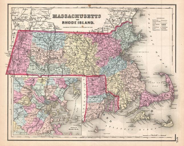 | Keywords: 1857 Colton Map of Massachusetts and Rhode Island - Geographicus - Massachusetts-colton-1857.jpg This is the uncommon 1857 issue of J H Colton ™s map of Massachusetts and Rhode Island Covers both states in their entirety along with a detailed inset of the vicinity of Boston Divided and color coded according to county Shows major roadways and railroads as well as geological features such as lakes and rivers Like most Colton maps this map is dated 1855 but most likely was issued in the 1857 issue of Colton ™s Atlas This was the only issue of Colton's Atlas that appeared without his trademark grillwork border Dated and copyrighted Entered according to the Act of Congress in the Year of 1855 by J H Colton Co in the Clerk ™s Office of the District Court of the United States for the Southern District of New York Published from Colton ™s 172 William Street Office in New York City NY 1860 dated 1855 Size in 16 5 14 object history credit line accession number Massachusetts-colton-1857 Colton G W <i>Colton's Atlas of the World Illustrating Physical and Political Geography</i> c 1857 edition Geographicus-source PD-old-100 Maps by Joseph Hutchins Colton Old maps of Massachusetts Old maps of Rhode Island 1857 maps |