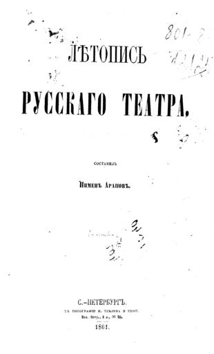 Keywords: РГБ: Арапов, Пимен Николаевич (1796-1861). Летопись русского театра / Сост. Пимен Арапов. - Санкт-Петербург : тип. Н. Тиблена и К°, 1861. - [4], IV, 386, [1] с., 1 л. фронт. (портр.), 1 л. портр.; 26 <a href="http://dlib.rsl.ru/rsl01003000000/rsl01003571000/rsl01003571875/rsl01003571875.pdf" rel="nofollow">dlib.rsl.ru/rsl01003000000/rsl01003571000/rsl01003571875/...</a> rsl 1861 russianstatelibrary ргб historyoftheatre историярусскоготеатра араповпн |