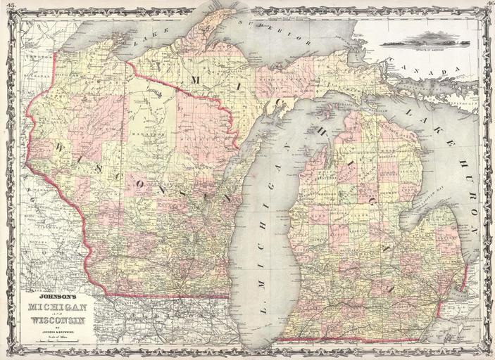 MAKE A MEME View Large Image Johnson Map of Wisconsin and Michigan - Geographicus - MIWI-j-62.jpg This is a beautifully hand colored 1861 lithograph map of Michigan and Wisconsin Includes a beautiful inset engraving of the Straits of Mackinaw which divide the northern ...