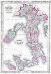 Keywords: 1864 Johnson's Map of Italy - Geographicus - Italy-j-64.jpg A marvelous 1864 map of Italy by the American cartographic publisher A J Johnson Depicts the Italian peninsula in the midst of its struggle for national solidarity Shortly before this map was published Garibaldi and his Red Shirts were fighting to unify the disparate city states Venetia Kingdom of Italy Piedmont Lombardy Aemilia Tuscany the Marches Umbria Sicily and the Papal States This is reflected in above map by the national barriers segregating both the States of the Church and the Duchy of Venice from the rest of Italy Includes the Kingdom of Sardinia Corsica and Sicily Lower left hand quadrant features an inset map of Malta Prepared by A J Johnson for inclusion as plate nos 88 and 89 in the 1864 edition of his New Illustrated Atlas ¦ Dated and copyrighted Entered according to Act of Congress in the Year of 1863 by A J Johnson in the Clerk ™s Office of the District Court of the United States for the Southern District of New York 1863 dated Size in 24 17 object history credit line accession number Italy-j-64 <i>Johnson's New Illustrated Family Atlas</i> 1864 or 1865 edition Geographicus-source PD-old-100 Maps by Alvin Jewett Johnson 1864 maps Old maps of Italy |