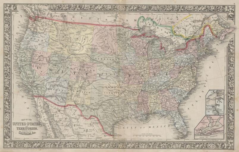 Keywords: 1864 Mitchell Map of the United States - Geographicus - UnitedStates-mitchell-1864.jpg A fine example of Mitchell ™s 1864 map of the United States Depicts the entirety of the continental United States along with parts of Canada and Mexico Depicts the country in considerable detail with notations regarding railroads mail routes including the famed Pony Express Routes emigrant routes westward topographical and political details Represents the 1864 state of the map in which the Western states are presented in an early ephemeral configuration Idaho embraces all of modern day Montana and Wyoming Arizona contains what is today the southern extension of Nevada including Las Vegas which is noted Two insets in the lower right quadrant feature Hampton Roads and Norfolk Harbo r as well as Pensacola Bay One of the most attractive American atlas maps of the United States to appear in the mid 19th century Features the floral border typical of Mitchell maps from the 1860-65 period Prepared by S A Mitchell for inclusion as map nos 9 10 and 11 in the 1864 issue of Mitchell ™s New General Atlas Dated and copyrighted Entered according to Act of Congress in the Year 1860 by S A Mitchell Jr in the Clerk ™s Office of the District Court of the U S for the Eastern District of Pennsylvania 1860 dated Size in 21 5 13 5 object history credit line accession number UnitedStates-mitchell-1864 <i>Mitchell's New General Atlas containing Maps of the Various Countries of the World Plans of Cities Etc Embraced in Fifty-three Quarto Maps forming a series of Eighty-Four Map and Plans together with Valuable Statistical Tables </i> 1864 Edition Geographicus-source PD-old-100 Maps by Samuel Augustus Mitchell Old maps of the United States 1864 maps |