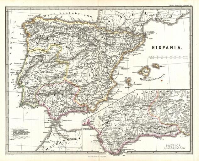 | Keywords: 1865 Spruner Map of Spain and Portugal - Geographicus - Hispania-spruner-1865.jpg This is Karl von Spruner ™s 1865 map of Hispania modern day Spain and Portugal Under the Roman Republic Hispania or Iberia was divided into two provinces Hispania Citerior and Hispania Ulterior “both of which are noted here Later during the Roman Principate Hispania Ulterior was divided into two new provinces Baetica and Lusitania while Hispania Citerior was renamed Tarraconensis which is illustrated on this map Spruner also includes a detailed inset showing Hispania Baetica modern day AndalucÃa one of three Imperial Roman provinces in Hispania modern Iberia Hispania Baetica was bordered to the west by Lusitania and to the northeast by Hispania Tarraconensis Shows names of ancient tribes and peoples and the areas they inhabited Map includes a scale and a legend in the upper-left quadrant Map notes important cities rivers mountain ranges and other minor topographical detail Territories and countries outlined in color The whole is rendered in finely engraved detail exhibiting throughout the fine craftsmanship of the Perthes firm 1865 undated Size in 16 13 object history credit line accession number Hispania-spruner-1865 Spruner Karl von <i>Spruner-Menke Atlas Antiquus </i> Gotha Justus Perthes 1865 Geographicus-source PD-old-100 Karl Spruner von Merz Old maps of Spain Old maps of Portugal 1865 maps |