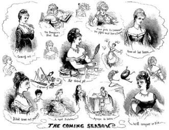 Keywords: 1870-London-season-cartoon.gif The Coming Season an 1870 cartoon satirizing the London social season as printed or reprinted in Harper's Bazaar magazine The main theme is young upper-class women and some not-so-young determined to find a husband during the social events balls etc of the season Vignettes include coming out ; being presented at court; mothers on the hunt for an eligible matrimonial catch for their daughters especially among the scions of nobility; a girl triumphantly throwing aside her books on being promoted from the schoolroom to the ballroom; changing fashions in artificial hair-buns etc Captions in image Depictions of five women Coming out Came out last Season Will conquer or Die Didn't come out yesterday Not shelved yet examining herself critically in mirror Depictions of two mothers The Dowager's Stud Book poring over PEERAGE book listing aristocratic heirs Four girls to commoners the fifth must have a coronet i e of nobility Engines of war beautifying implements A propos de bottes rummaging through drawers big pile of shoes on the floor A royal Salute deep curtsey as one is formally presented to royalty Harper's Bazaar 1870 unknown 1870 artist PD-old-70-1923 1870 cartoons Hair fashion Harper's Bazaar Flirting Curtseys 1870 in London Social history of London |