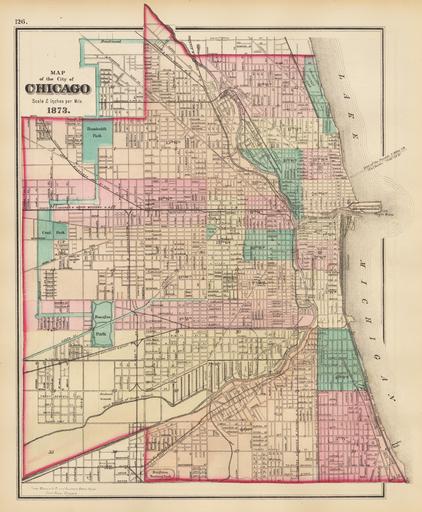 Keywords: 1873 Chicago map by Warner & Beers.jpg This map of the Chicago is color coded by ward The map shows the city just two year after the great Chicago Fire of 1871 Each street is labeled and all railroad lines are noted throughout the map Park and boulevards are colored in green and the reaches of the city is outlined in red A line extending northeast off the coast delineates the tunnel to the fresh water intake crib The map identifies Soldier ™s Graves Confederate POWs near Lincoln Park which were earlier noted as Rebel Graves The monument to Senator Stephen Douglas and his grave site is also noted at his former property at 35th and Lake Railroads and waterways converge at the mouth of the Chicago River and resulted in what was once the artery for goods and raw materials to pass though from the eastern states to the ever-developing western frontier This convergence is what was responsible for Chicago ™s enormous growth from a small mid-western town to a national and eventually international powerhouse city of commerce and trade Warner Beers 1873 https //www hjbmaps com/products/antique-map-city-of-chicago-warner-beers-1873 HJB Maps PD-old map date 1873 Chicago 2 inches per mile warp status Warner Beers print date 1873 accession number cm 40 7 35 other versions http //imagesearchnew library illinois edu/cdm/ref/collection/maps/id/2244 1873 maps Old maps of Chicago Chicago in the 1870s 1873 in Illinois Water cribs in Chicago